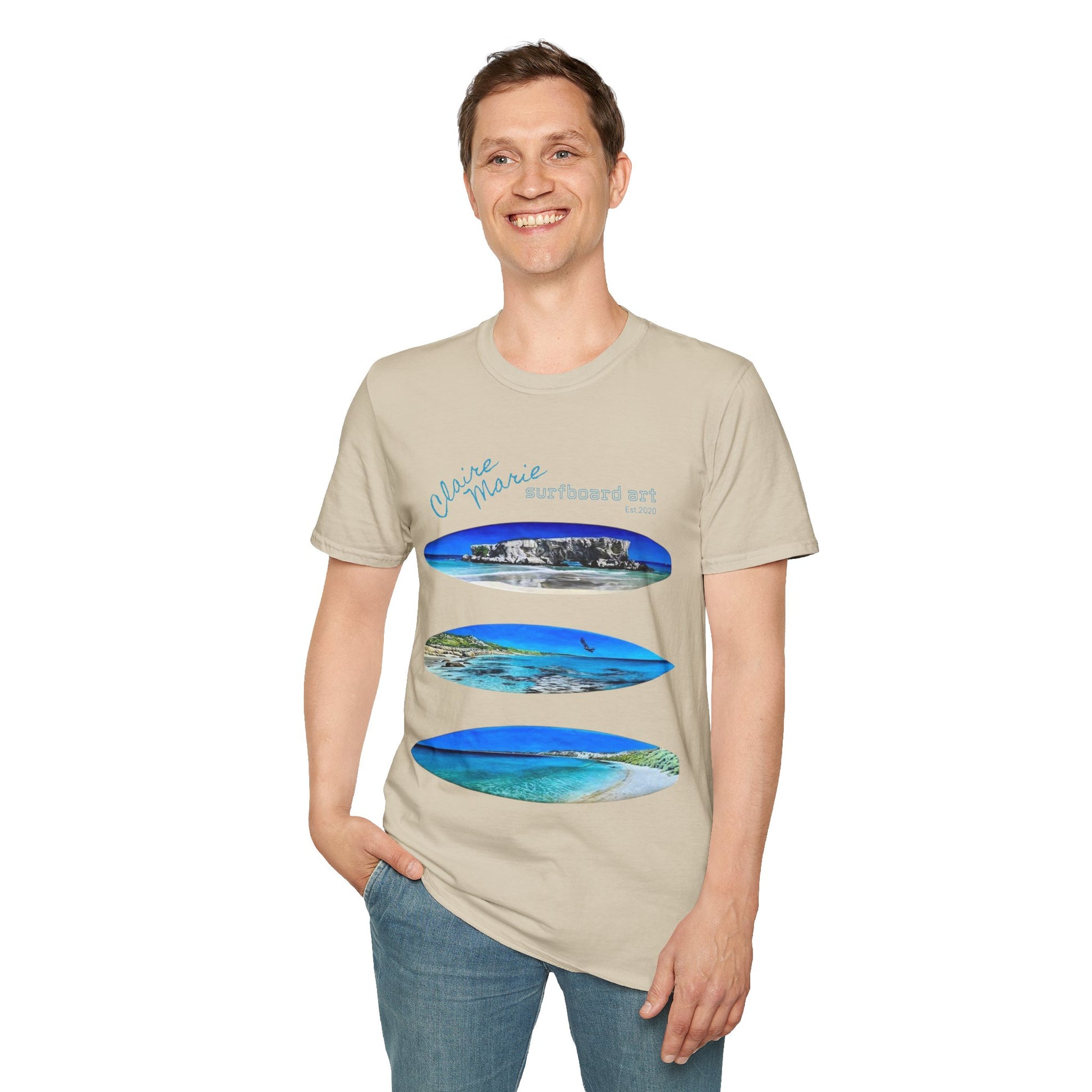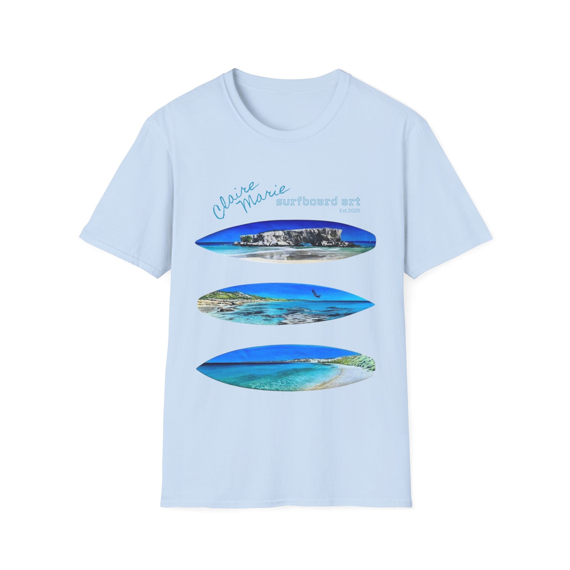 Celebrate the beauty of ocean-inspired creativity with this exclusive t-shirt featuring three of Claire Marie’s iconic surfboard artworks. Each design captures the coastal spirit and vibrant storytelling that define her unique style.