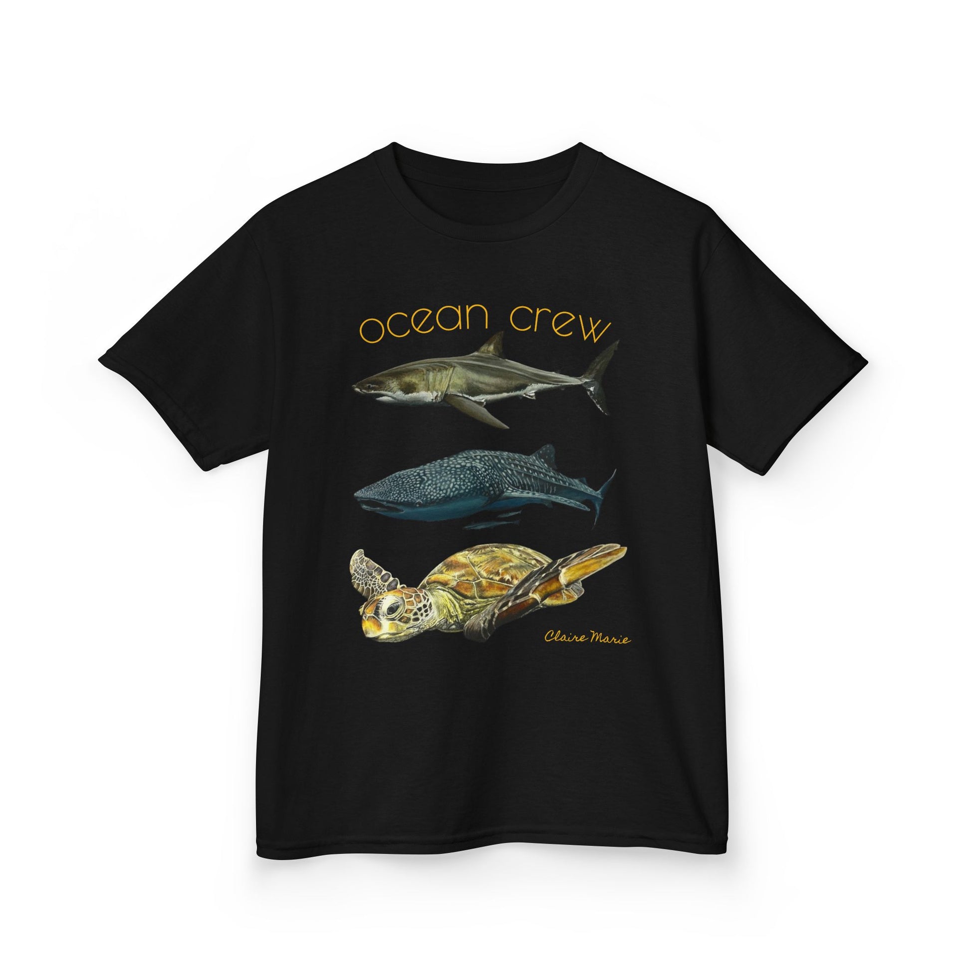 This Kids t-shirt features three of Claire Marie’s marine life paintings—the graceful sea turtle, the ocean guardian himself - the shark, and the gentle whale shark. Join the Ocean Crew and wear it on the beach or when you want to be reminded of the ocean you love. This t-shirt will be a conversation starter with other likeminded marine life lovers.